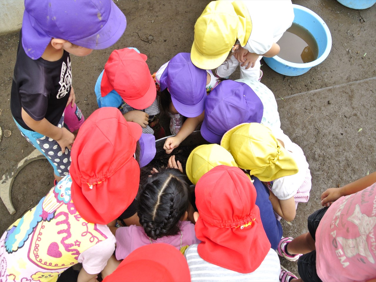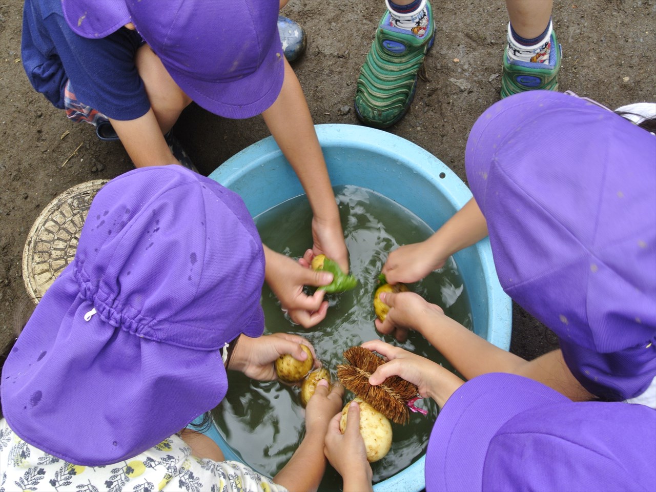じゃがいもを洗い終わってから・・・・・みんな頭をくっつけてのぞいてるものはなんでしょう??