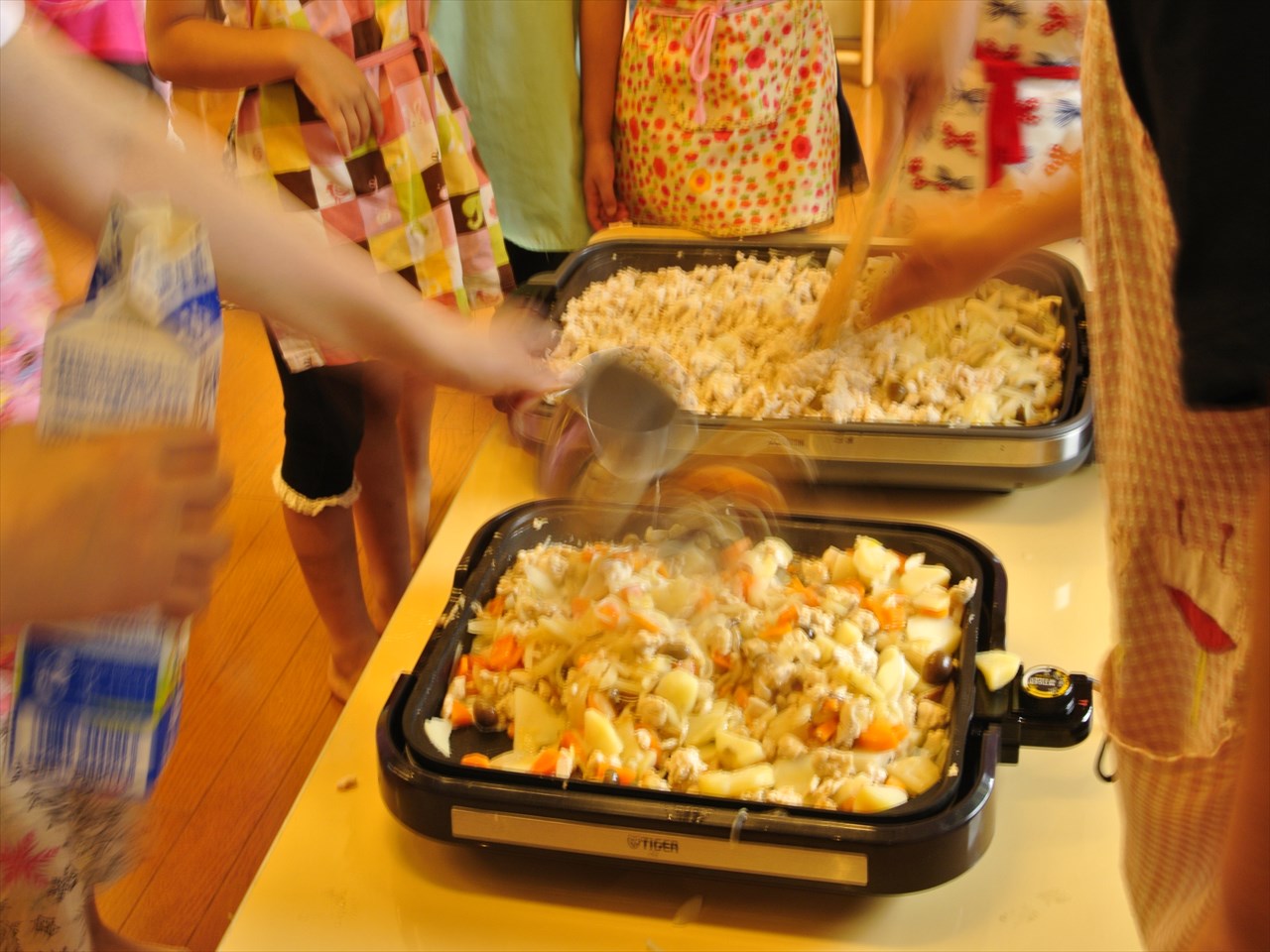 ホットプレートで炒めて、牛乳やマヨネーズを入れて、チーズを加えて・・いいにおい〜〜〜給食が楽しみだね〜