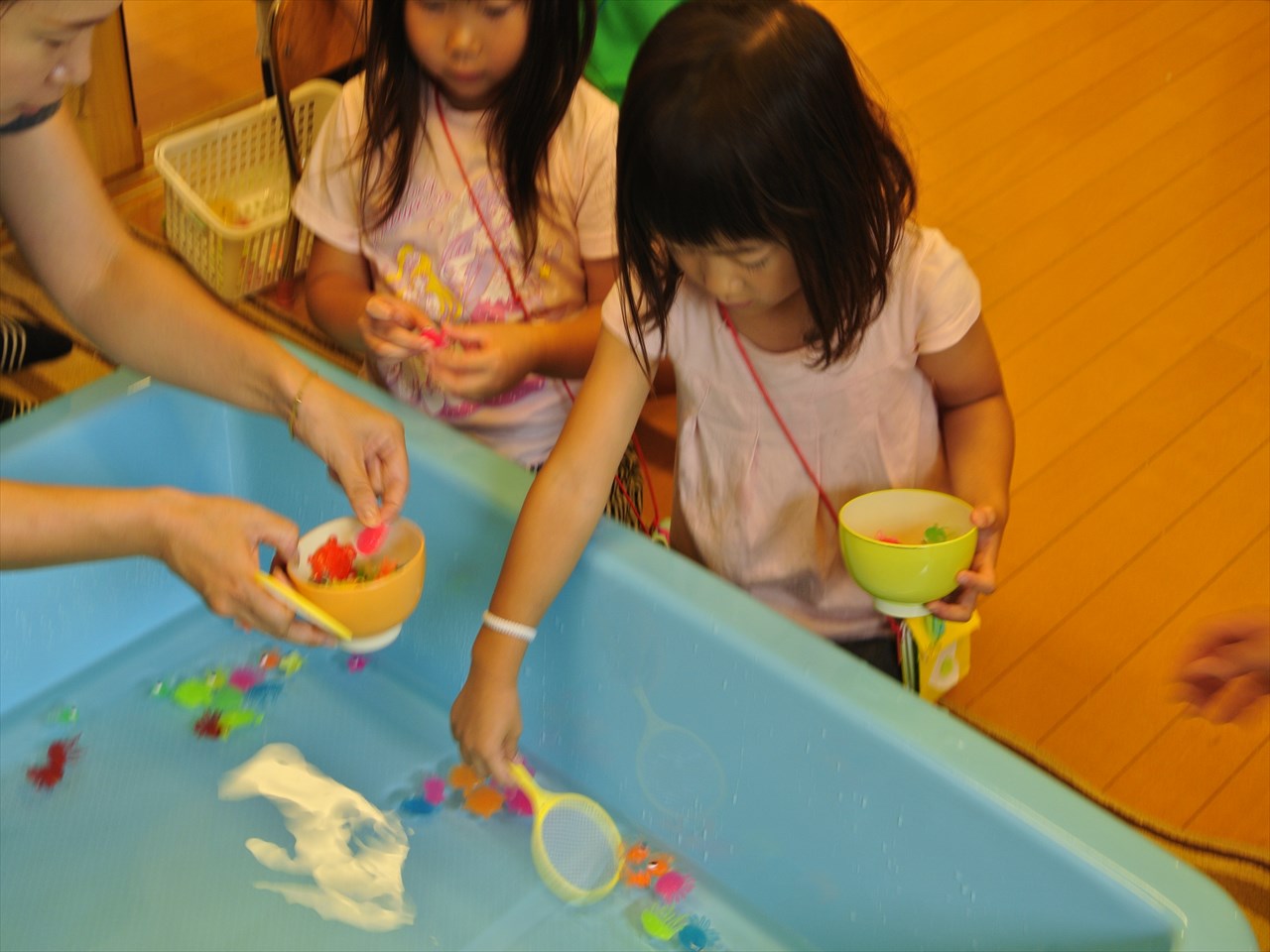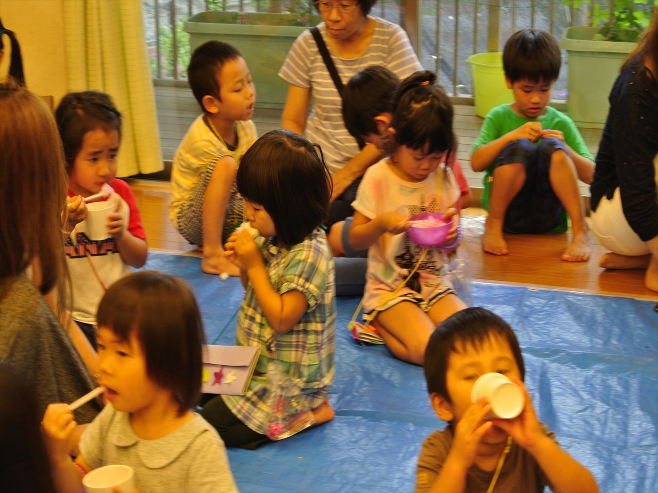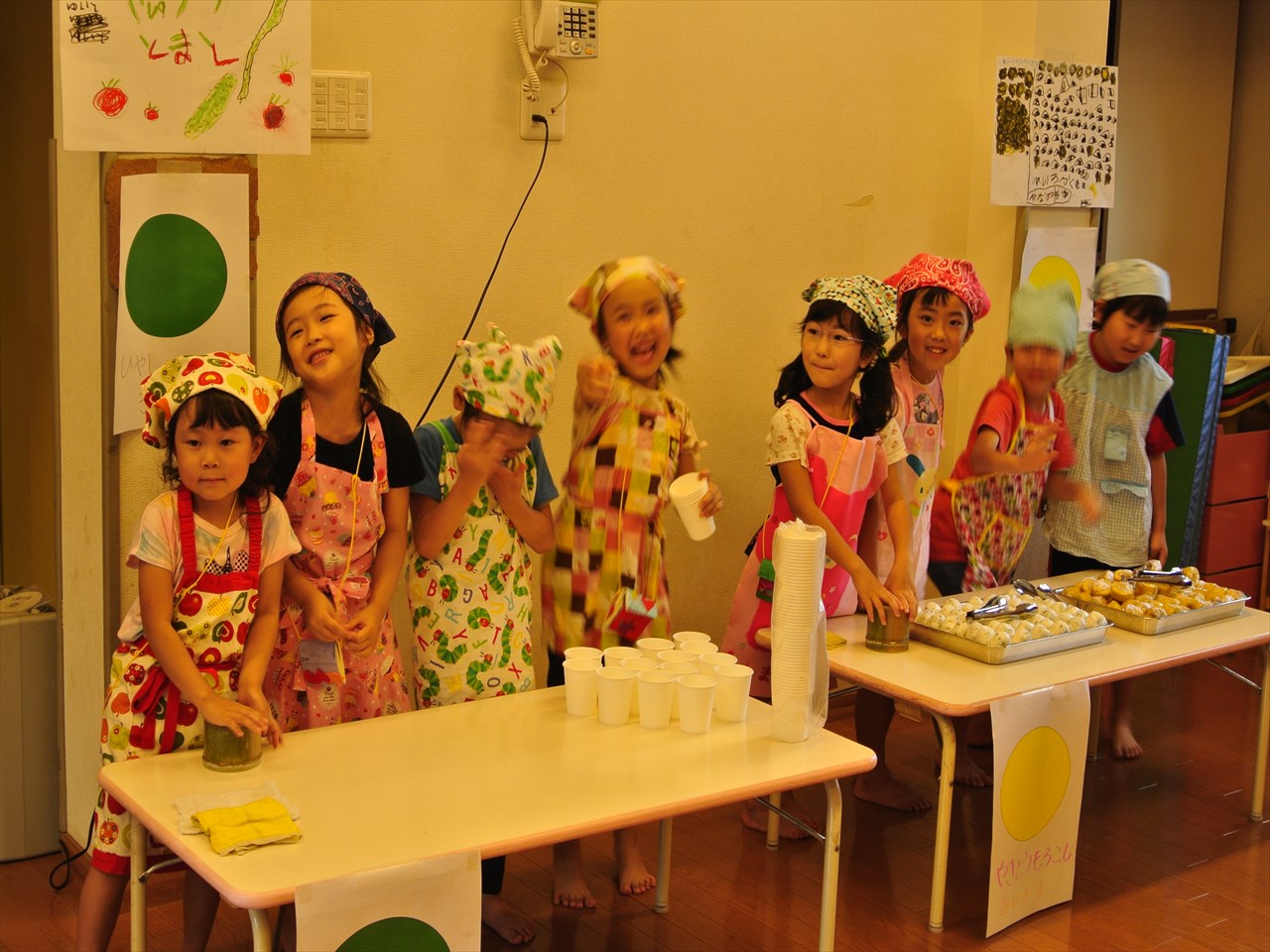 ぶどう組の『なつまつり はじまりま〜す』のかけ声とともに始まりました。ぶどう組は冷やしきゅうりとトマト屋のお店やさんになりました。『いらっしゃ〜い』