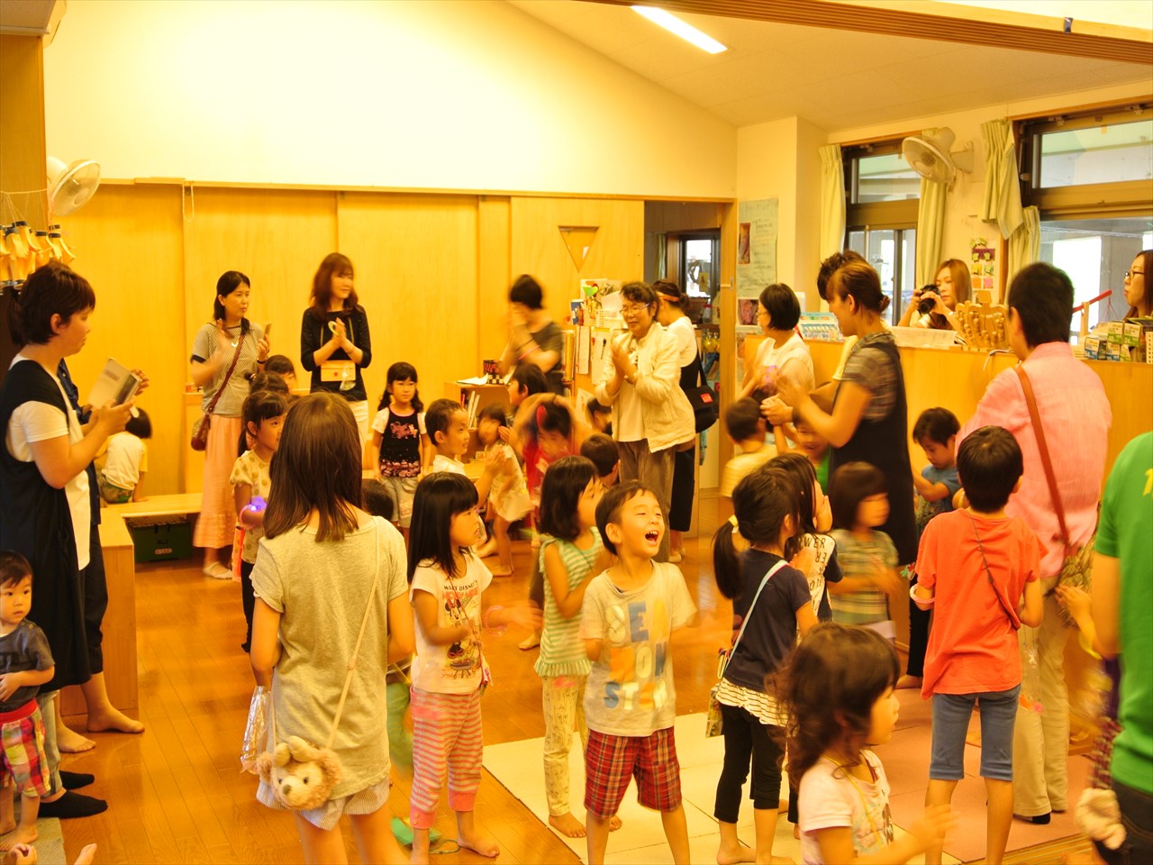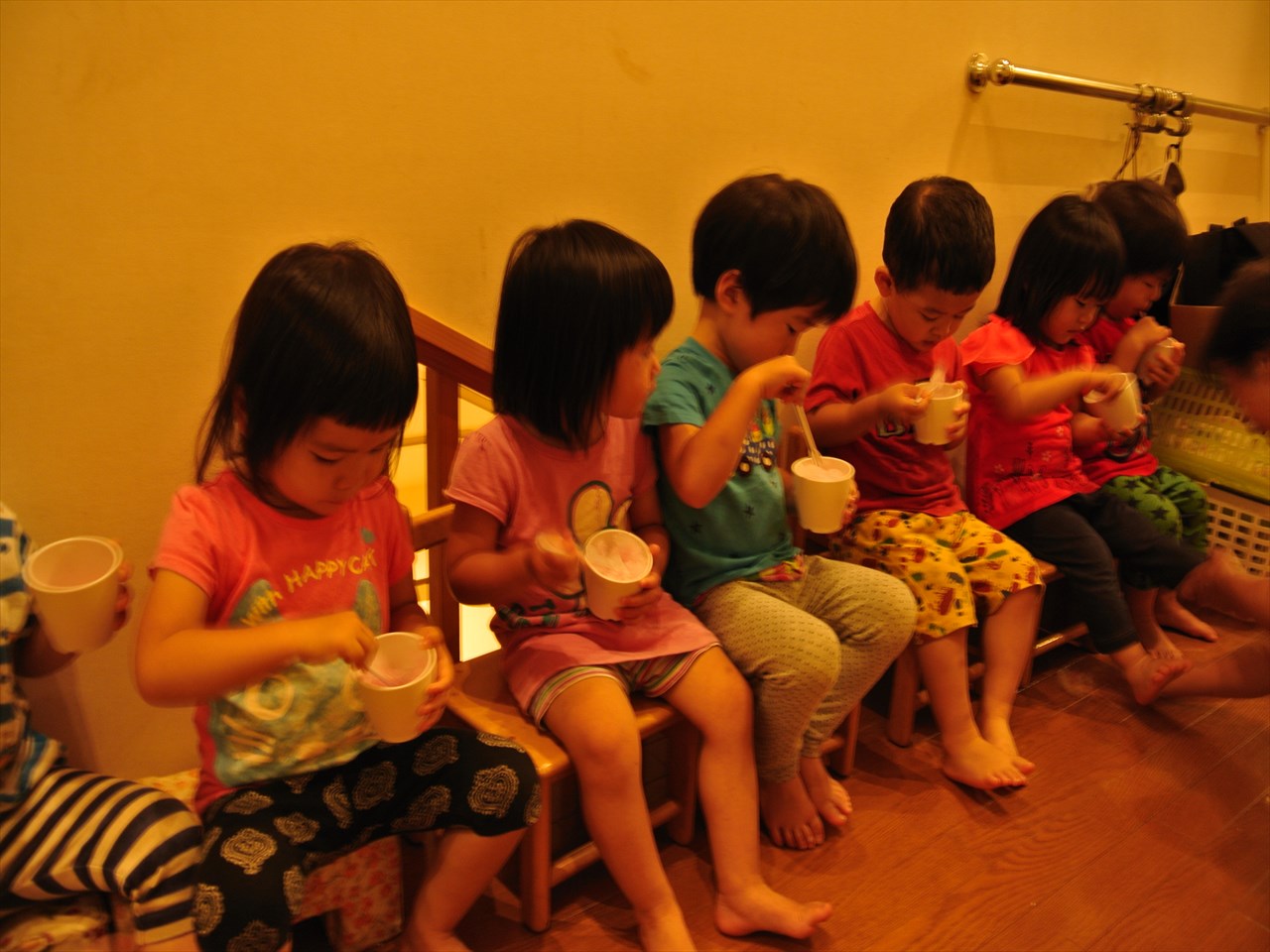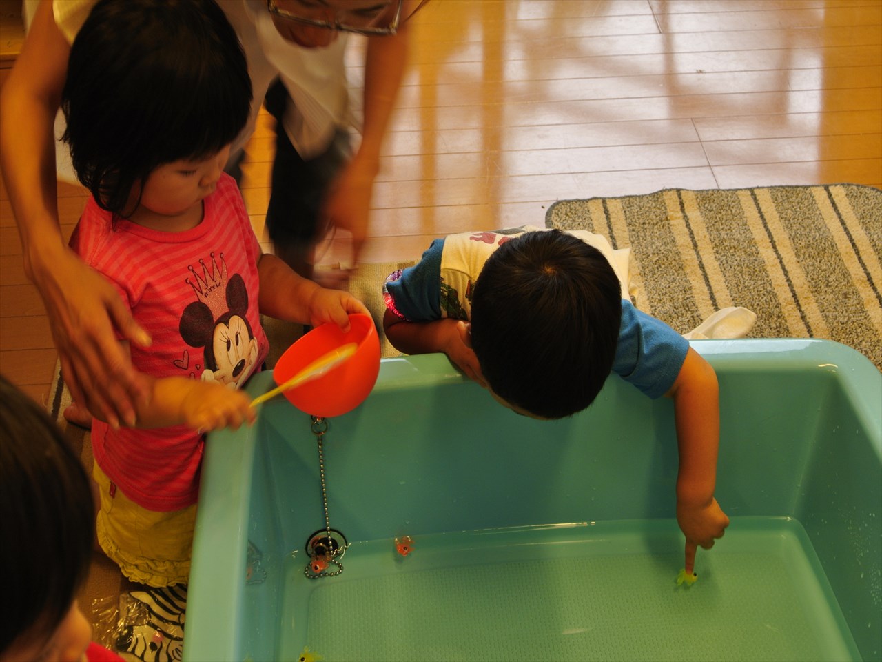 ぶどう組の『なつまつり はじまりま〜す』のかけ声とともに始まりました。ぶどう組は冷やしきゅうりとトマト屋のお店やさんになりました。『いらっしゃ〜い』