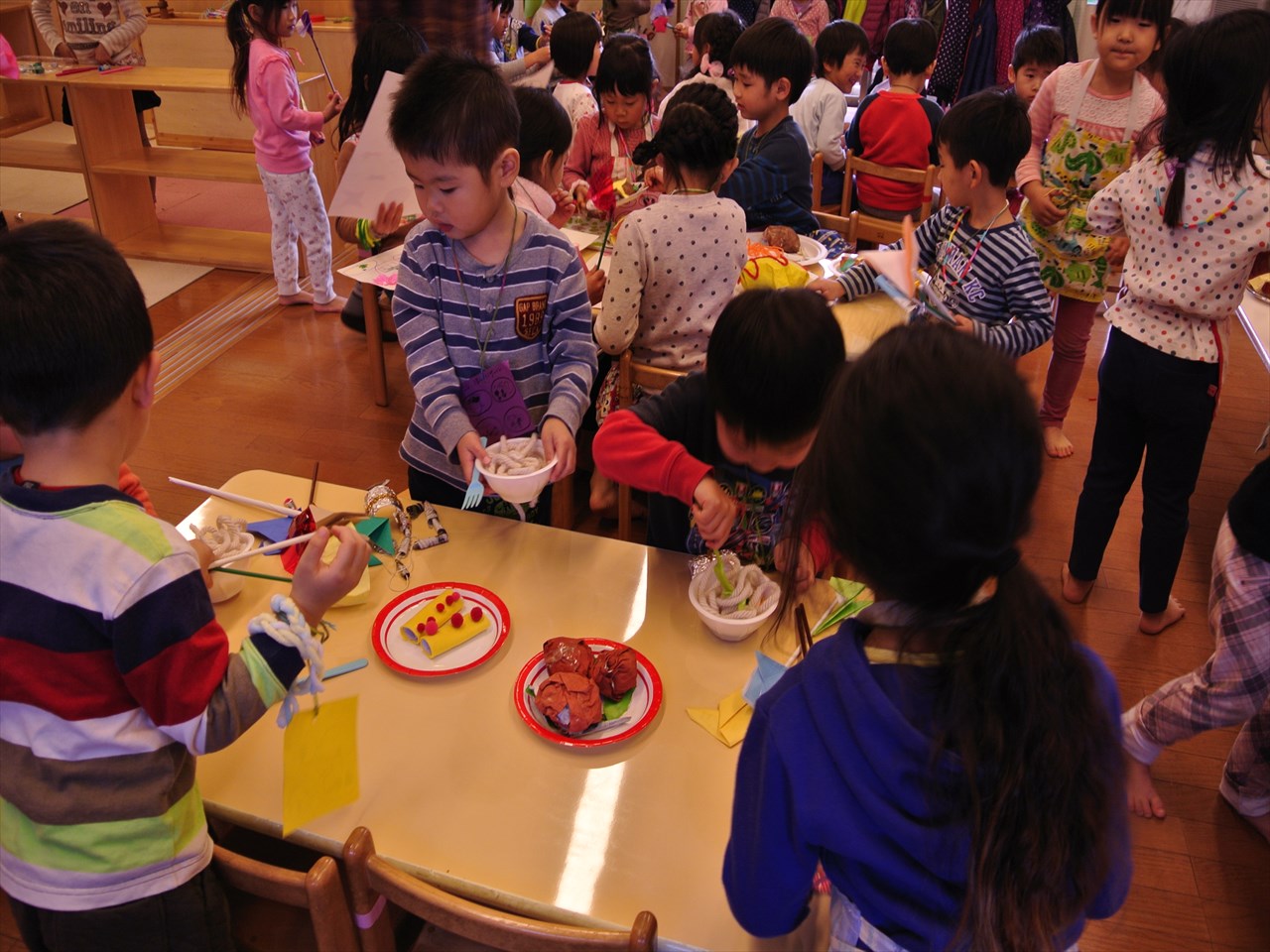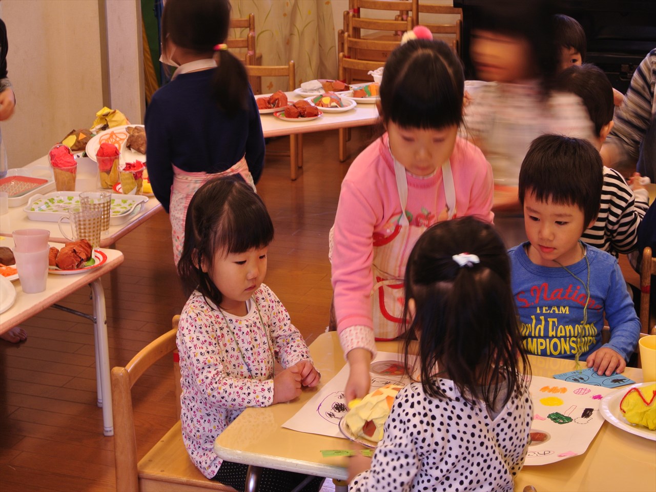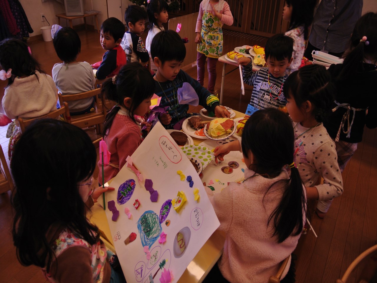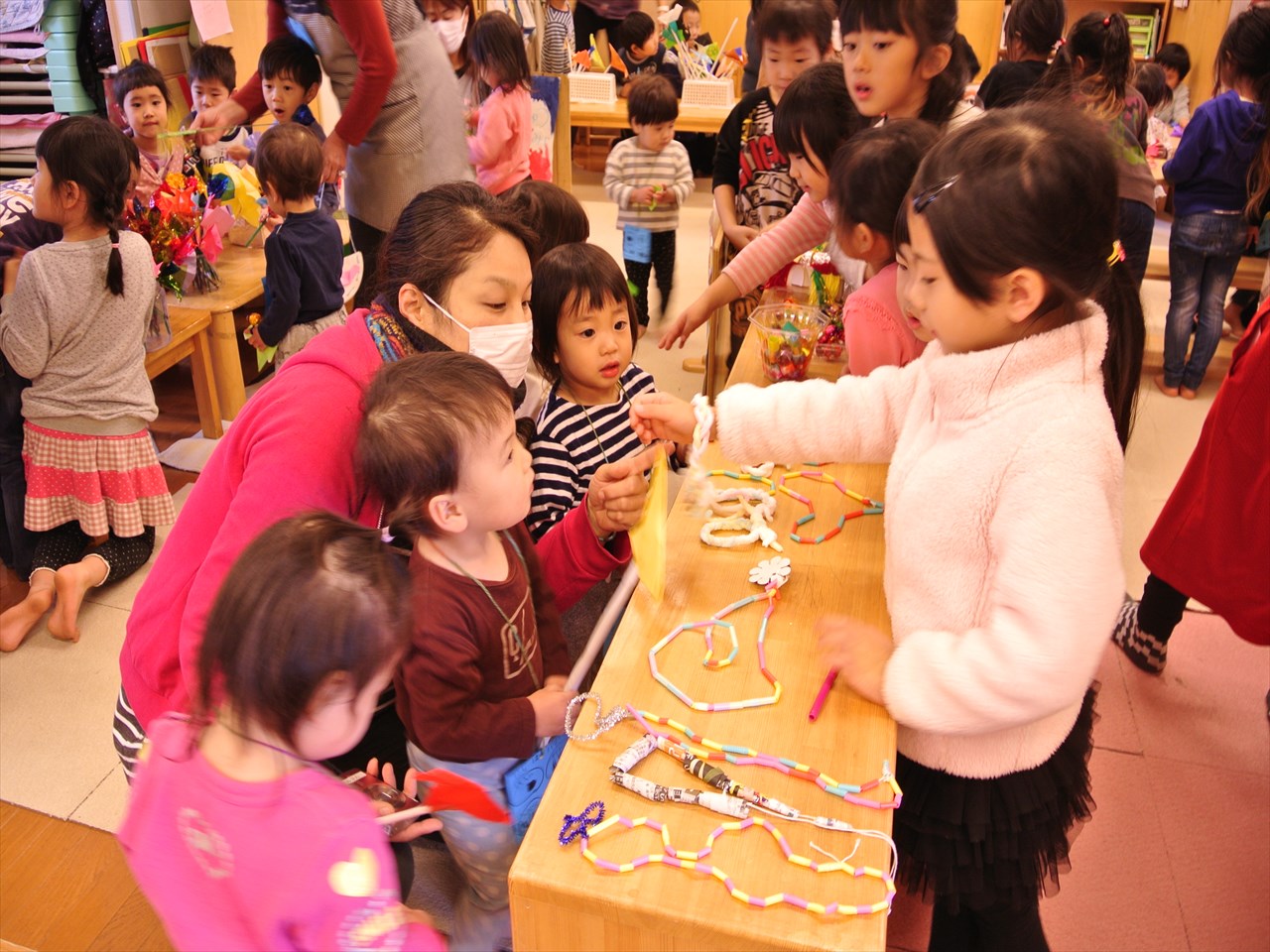 にじ・ほしバザール開催しました。それぞれのお店屋さんには豪華な品物が並びました。 レストランの案内役♪