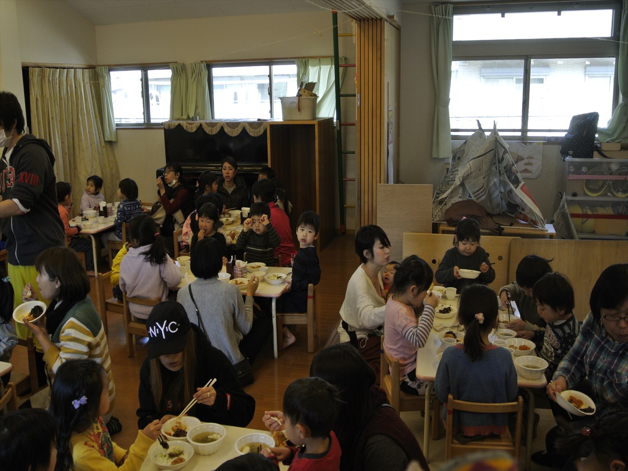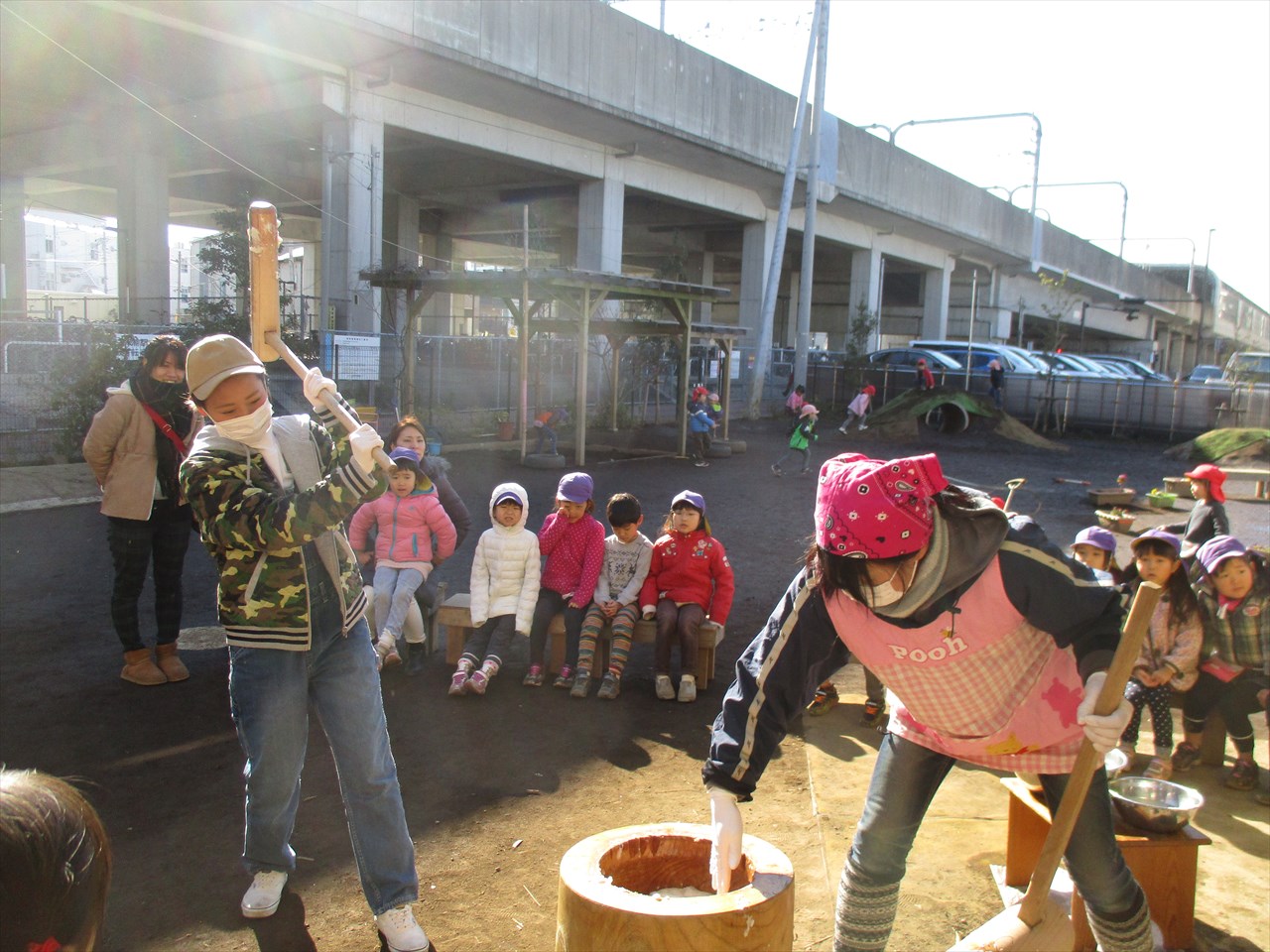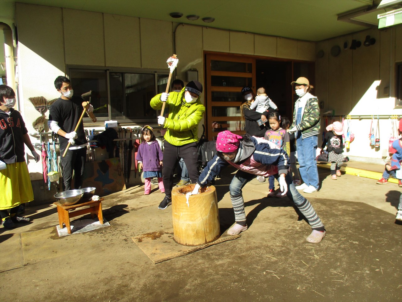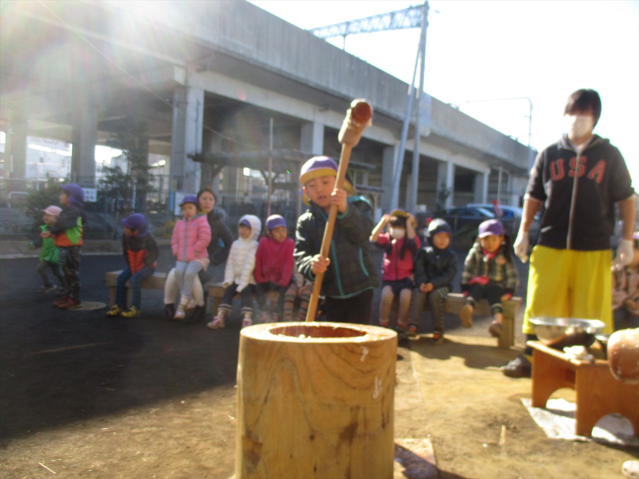 今日はおもちつきでした。園庭にはよいしょ!よいしょ!!の元気な声が響きました。 なぜか『きょうだいがんばんれ〜!』というかけ声も・・・・