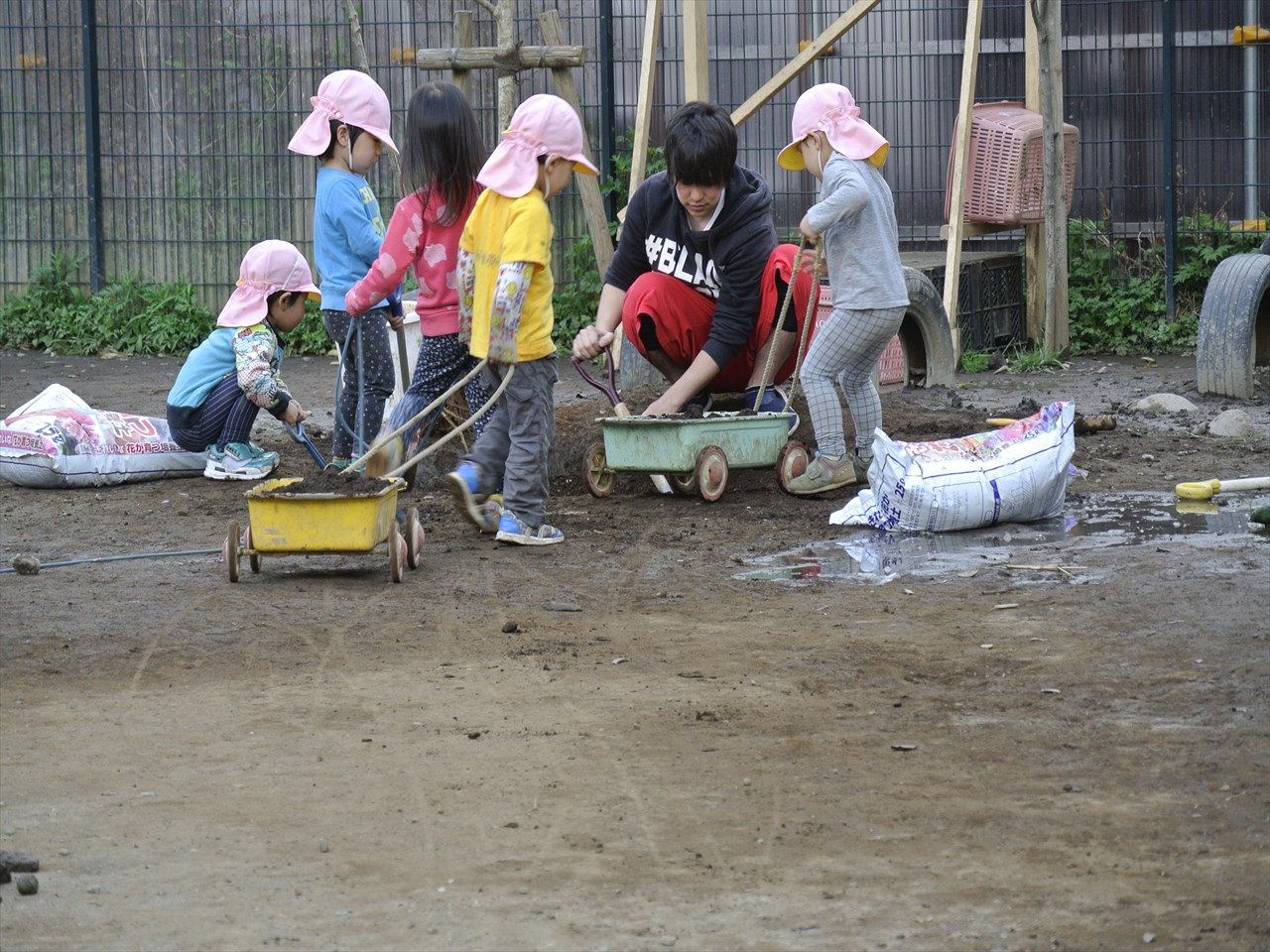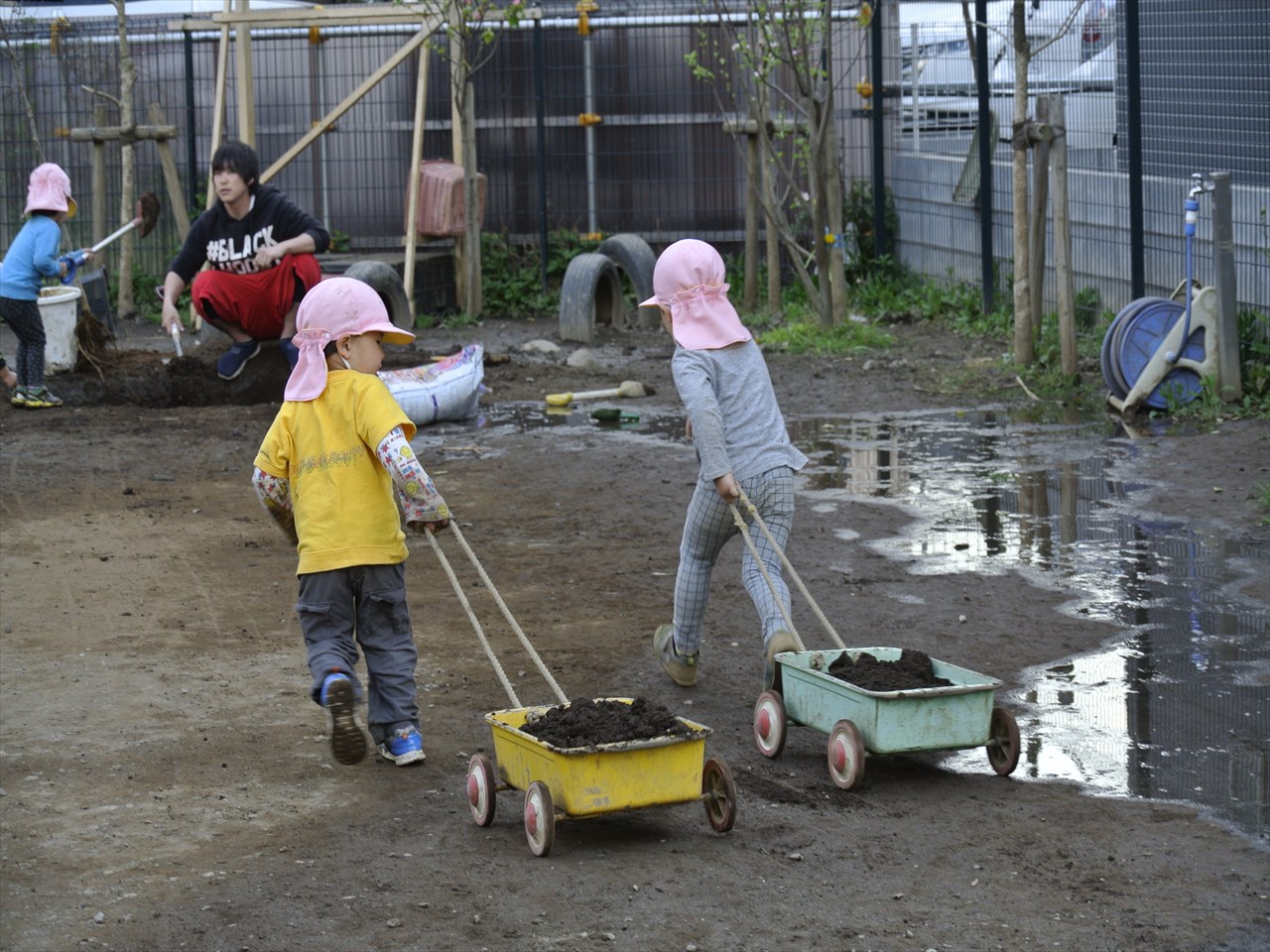 昨年度卒園したぶどう組が、保育園に記念樹として、どんぐりの木をプレゼントしてくれました。 用意した土だけでは足りず、畑の隅っこの土をせっせと運び、