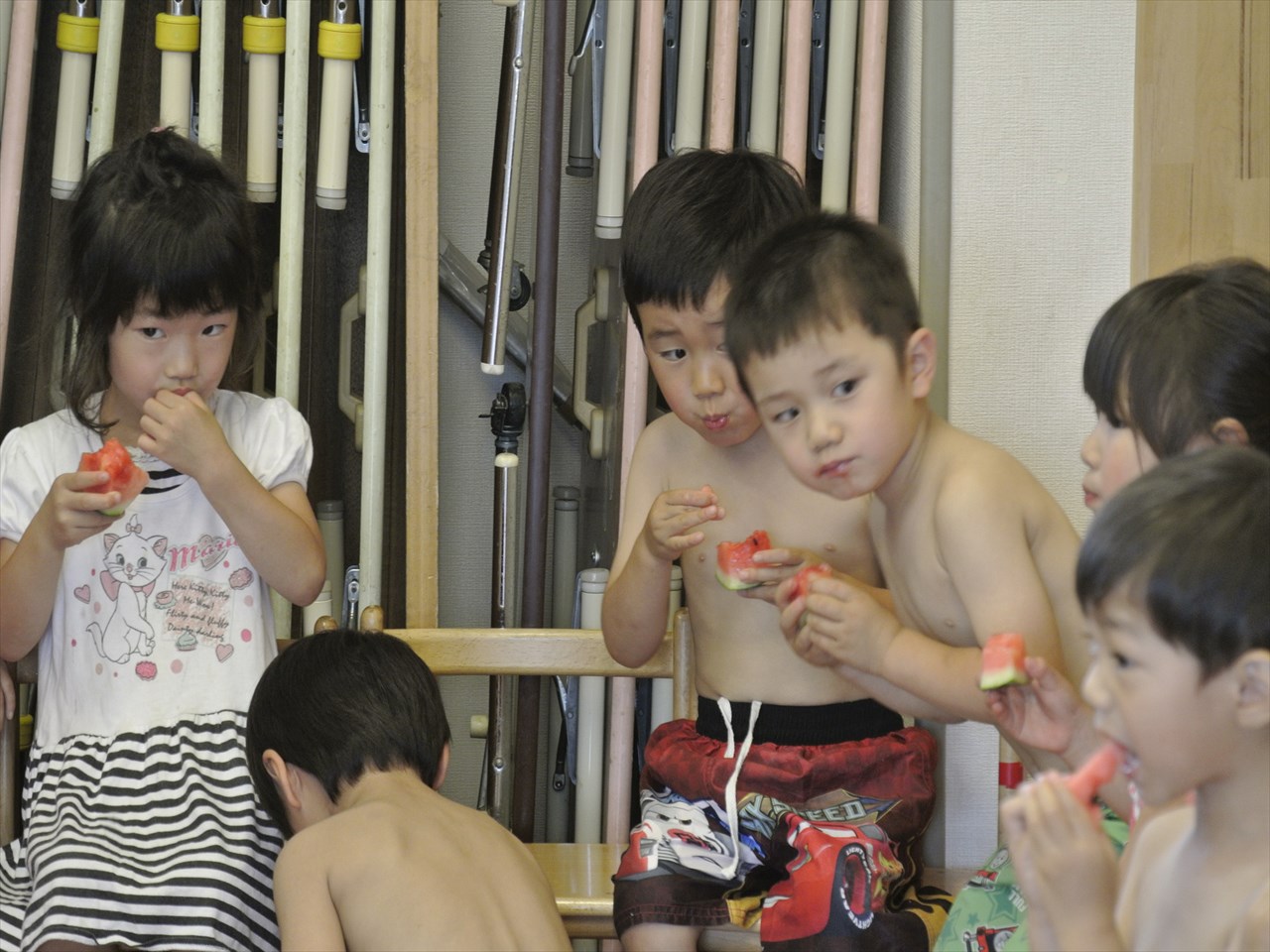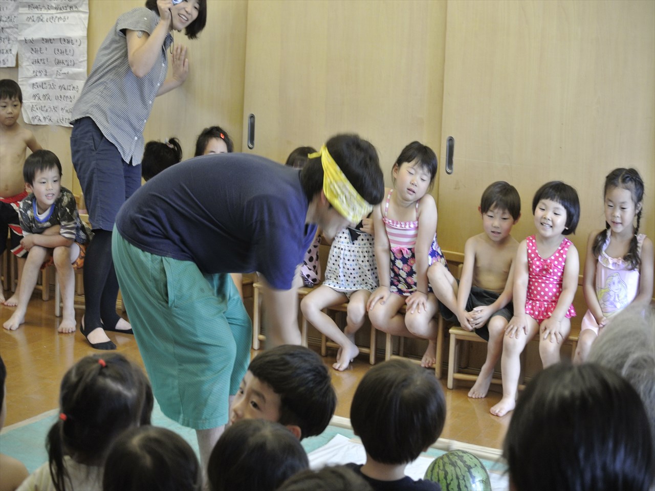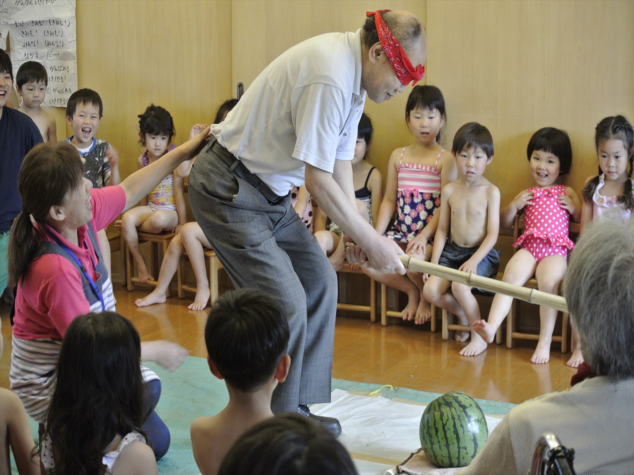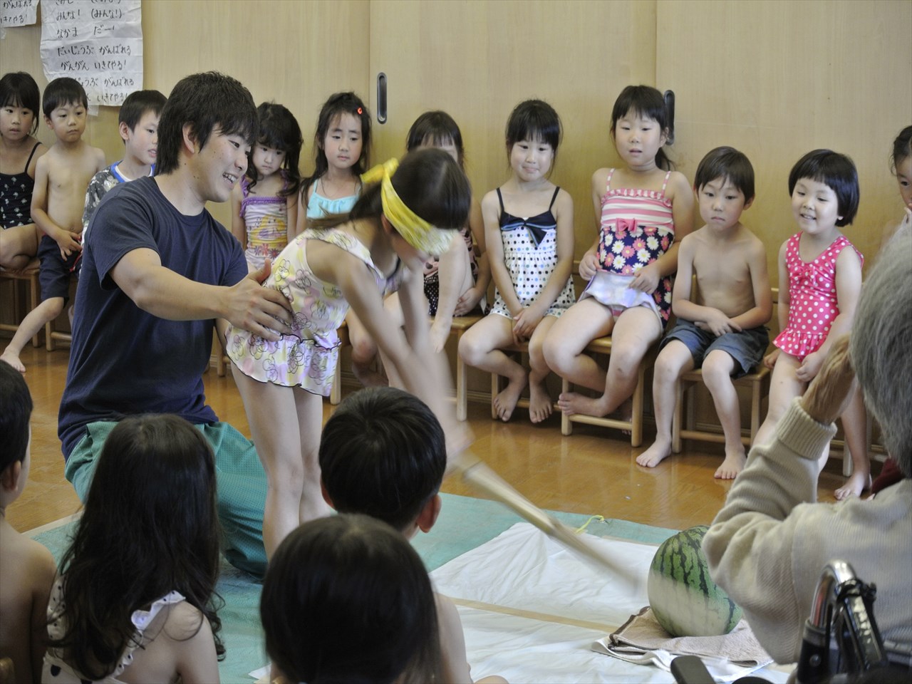 今日は、すこやか福祉会の馬渡さん家のおじいちゃん、おばあちゃんも遊びに来てくれて、一人のおじいちゃんがすいか割りに挑戦!・・・でもわれませんでした。