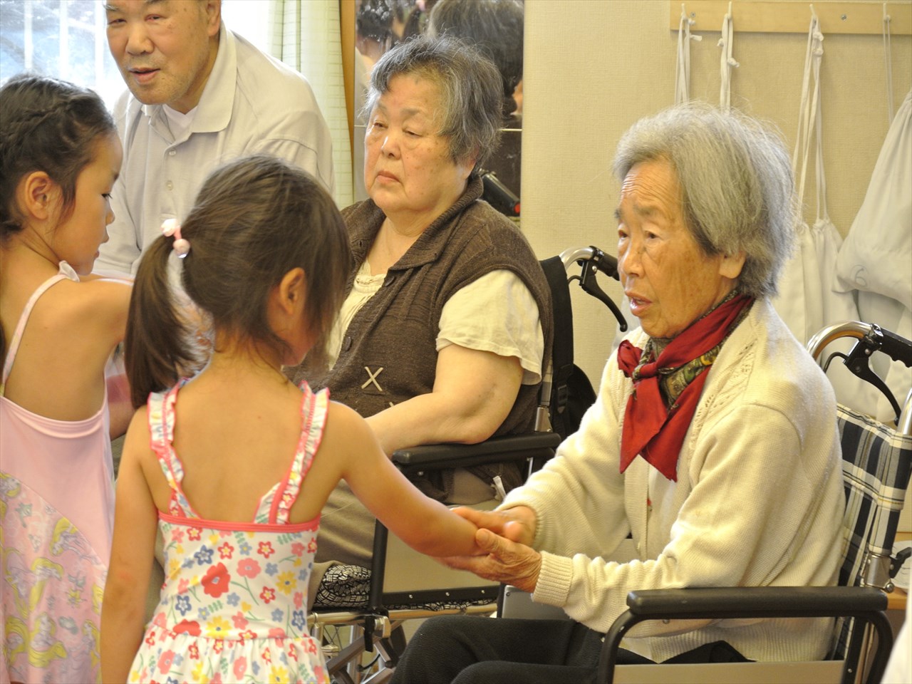 そのあと、おじいちゃん・おばあちゃんと交流。握手したり、何の食べ物が好きですか?と質問したり、