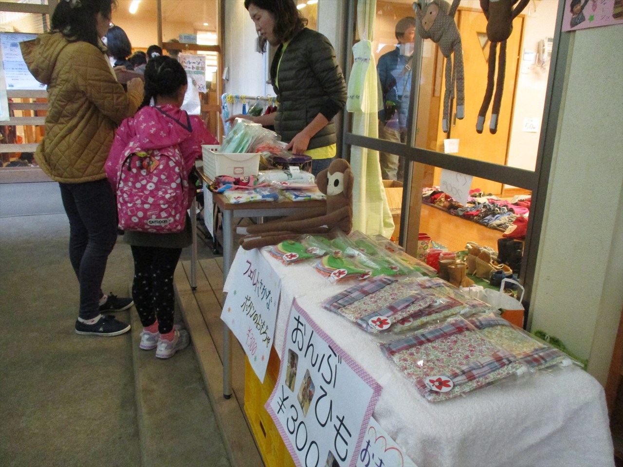 あいにくのお天気となってしまいましたが、たくさんの来ていただきました。遊びコーナー どんぐりで遊ぼう 手作り品♪在園児のおばあちゃんの手作り品や職員の手作り品を売りました。
