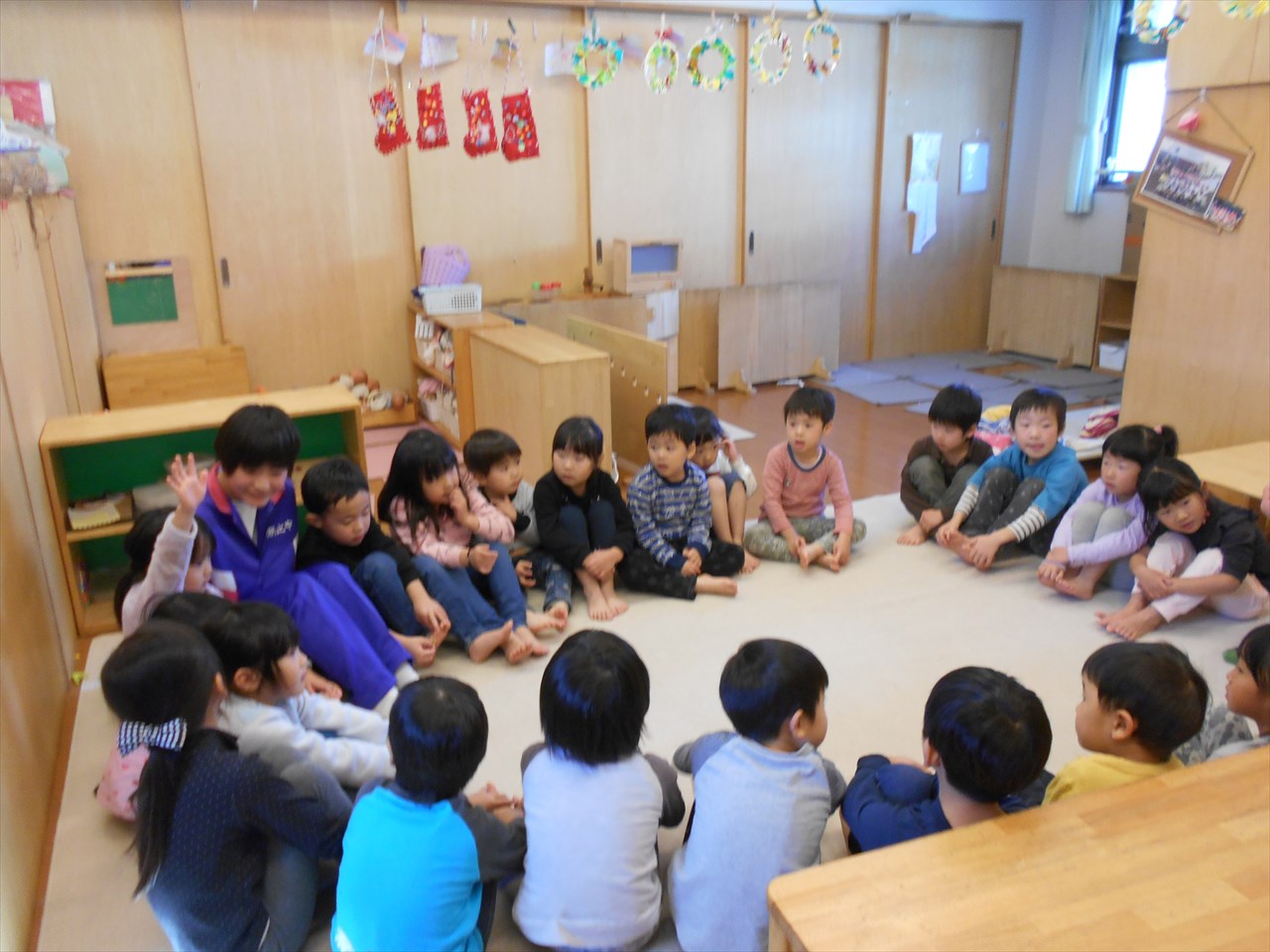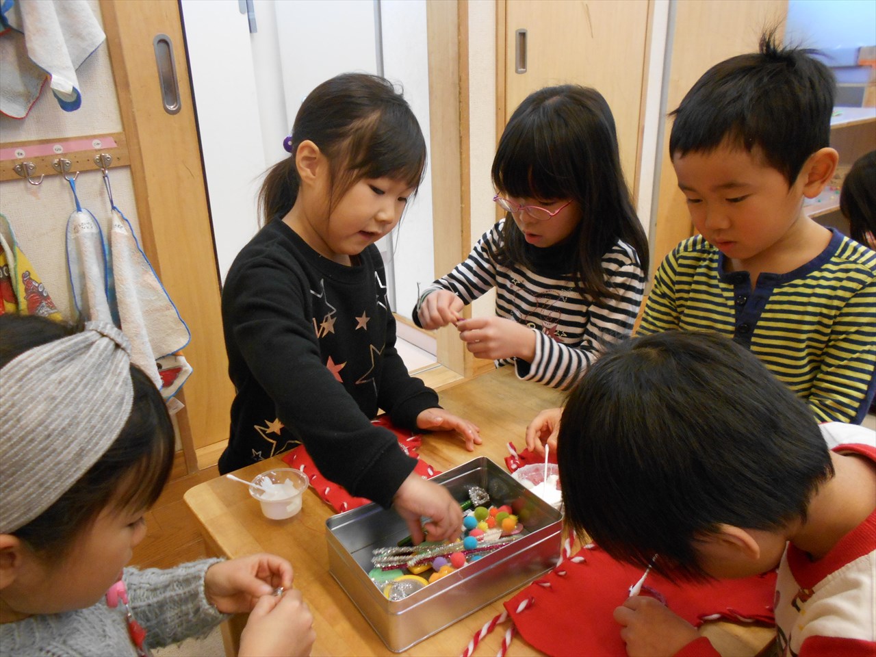 大瀬小2年生の町探検 保育園のことをいろいろ質問し、一生懸命書き込んでいました。そのあと、幼児の部屋へ行き、クリスマス飾りつくりの手伝いをしてくれました。
