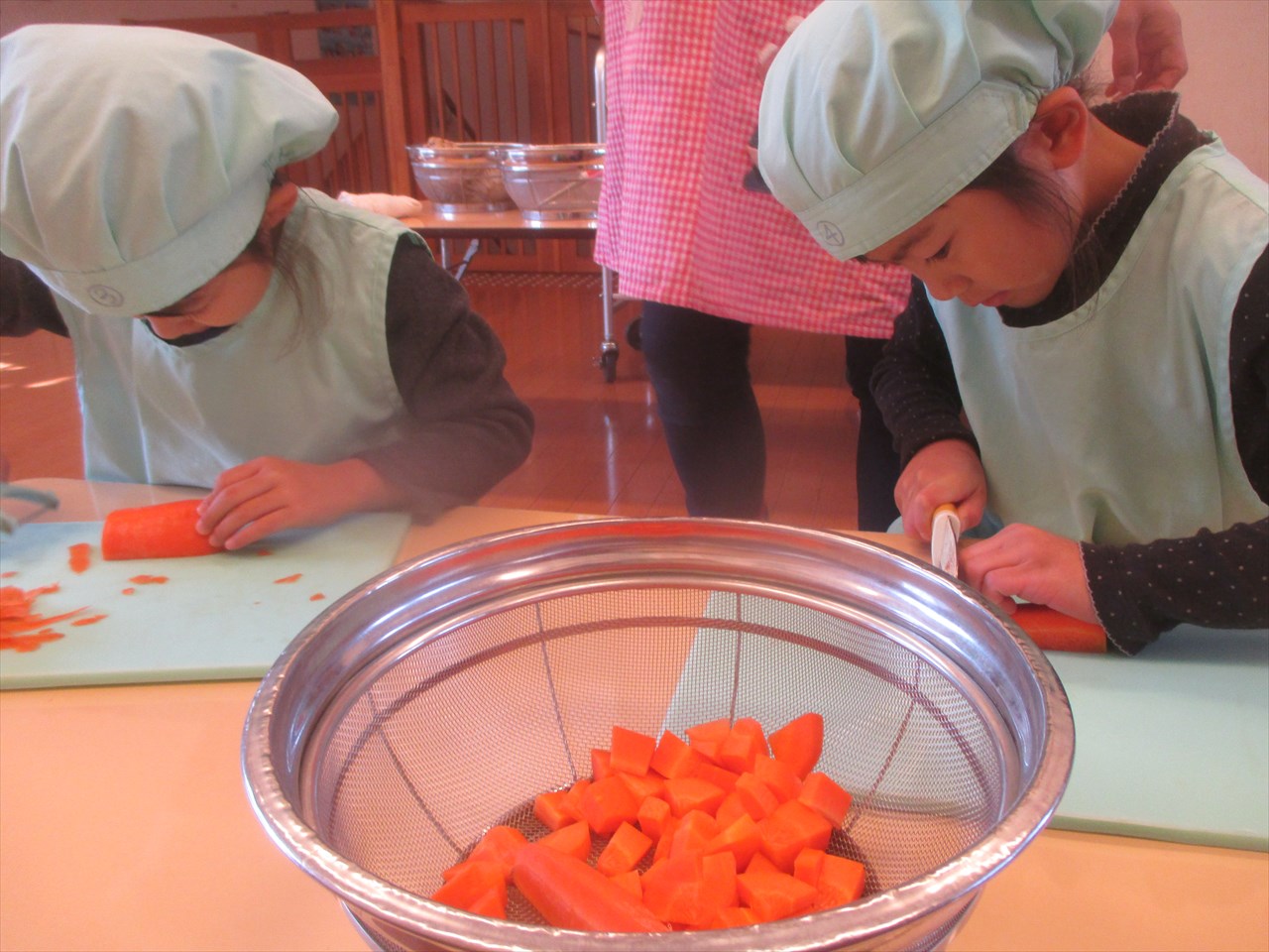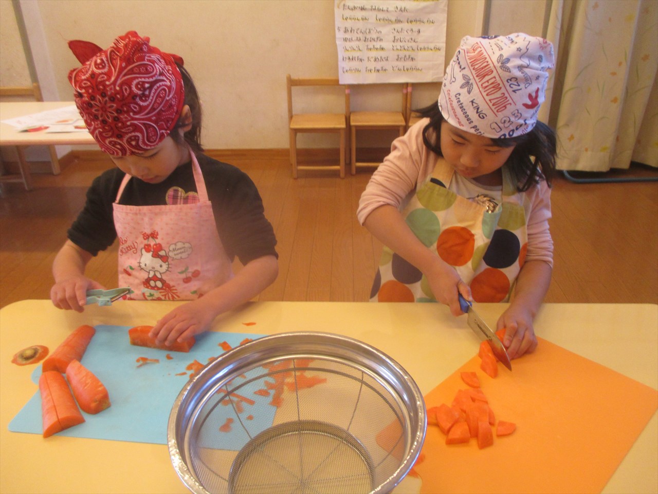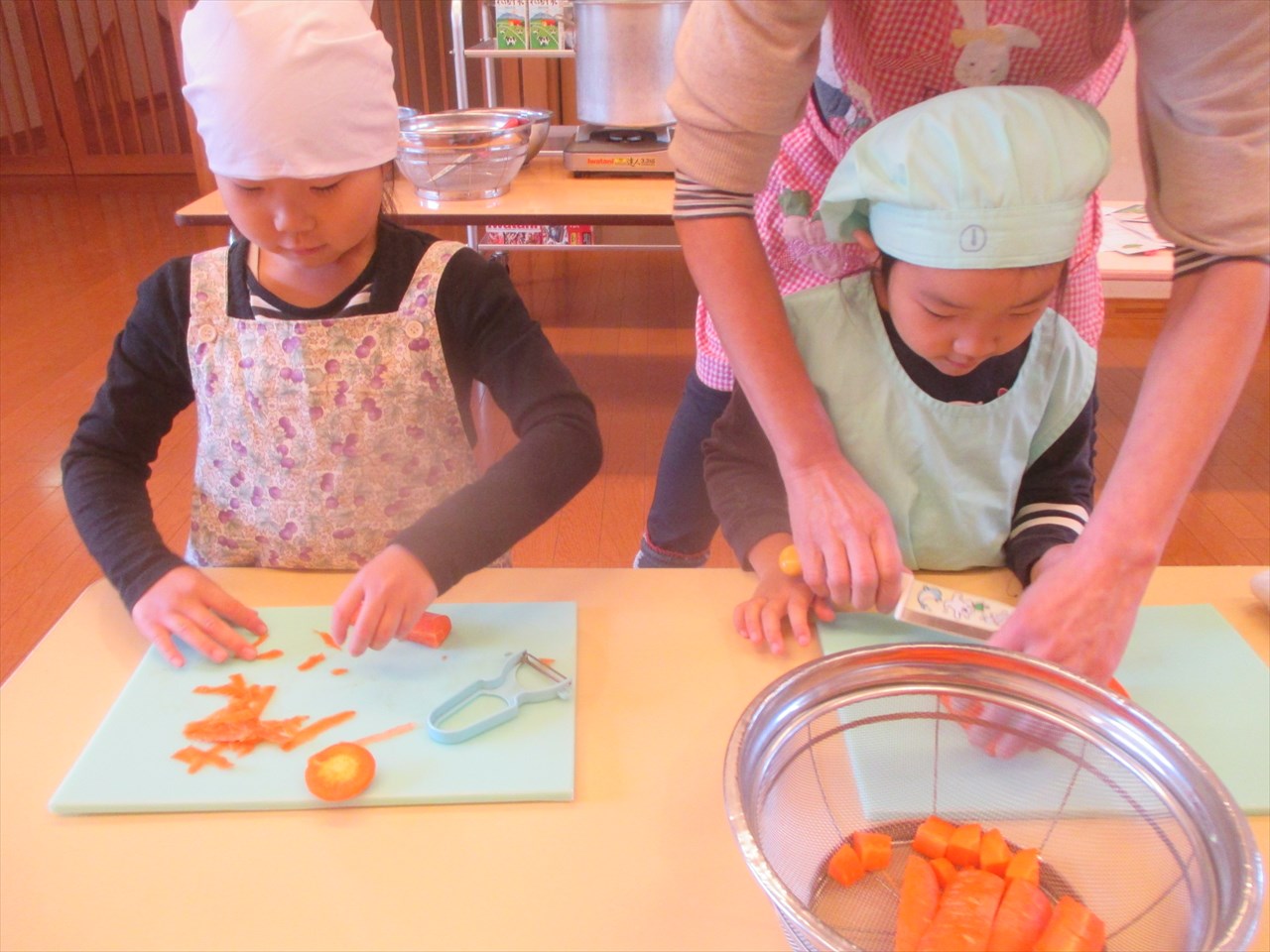 野菜や肉はどんな力になるのかな?と考えながら、クッキングスタート!