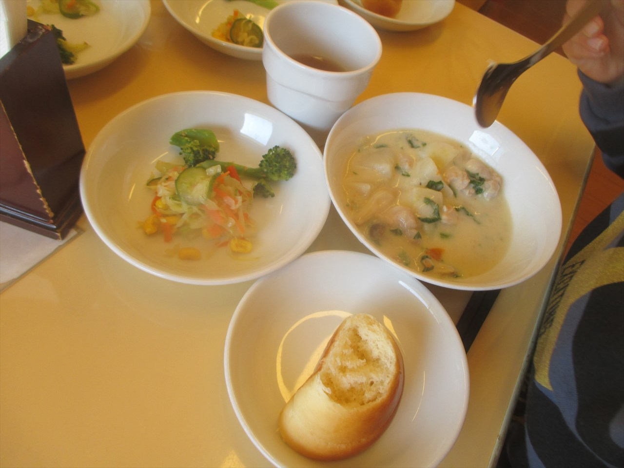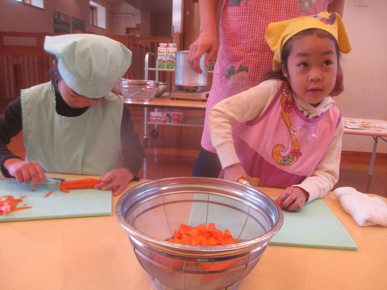 給食の時間に自分で作ったシチューはどう?と聞くと、みんな笑顔で『おいしい〜』りんご、もも組もおいしい〜といい笑顔でした。