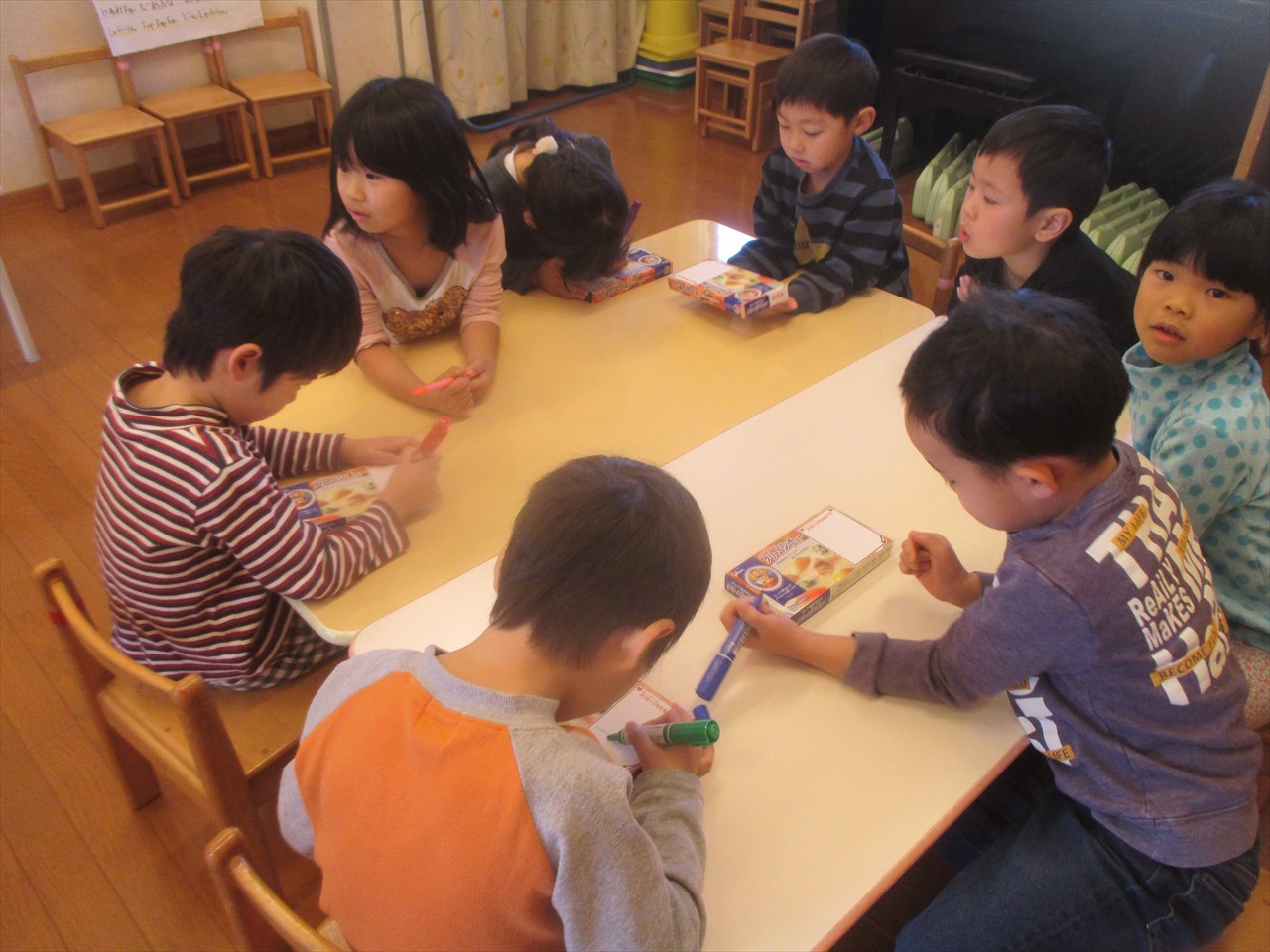 煮込んでいる間にお母さん、お父さん、おばあちゃんにプレゼントのルゥにメッセージを書き込みます。