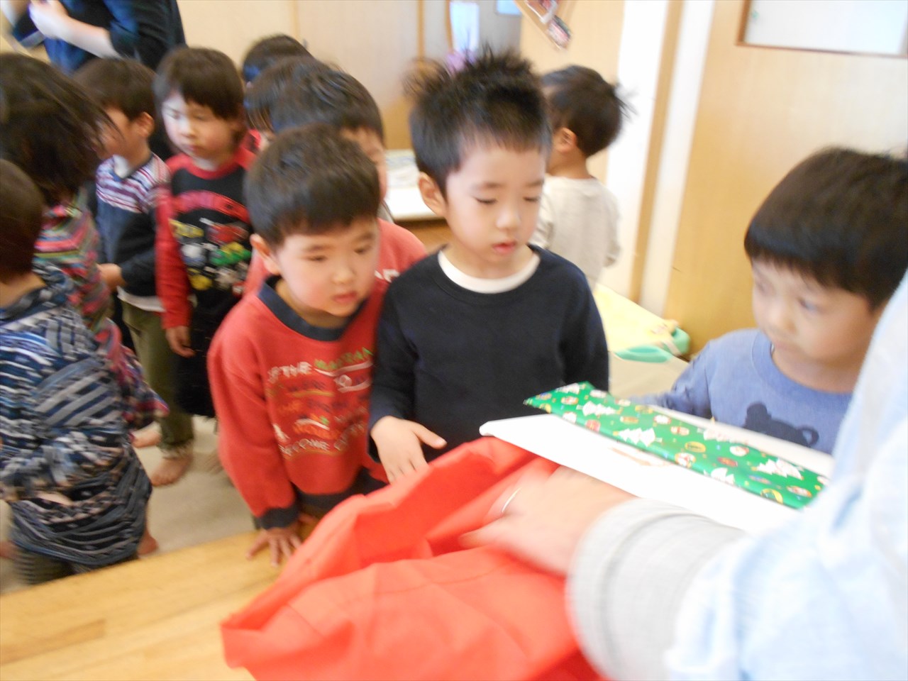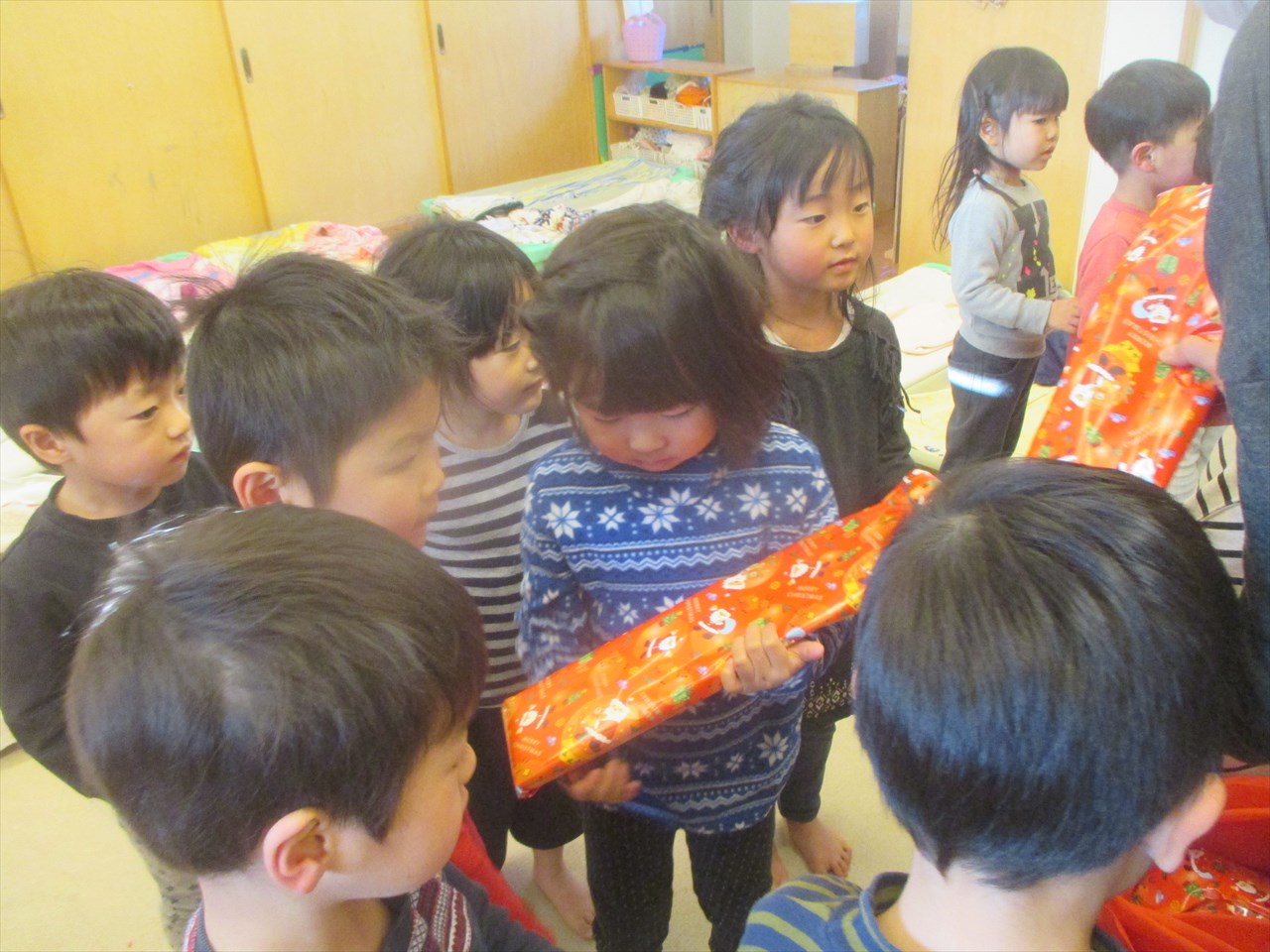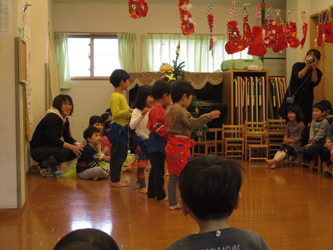 ホールにみんな集まって、クリスマス会を行いました。まずは、ぶどう組のピアニカ演奏。ドキドキ緊張しているお友達だちもいたようですが、一生懸命が伝わってきました。