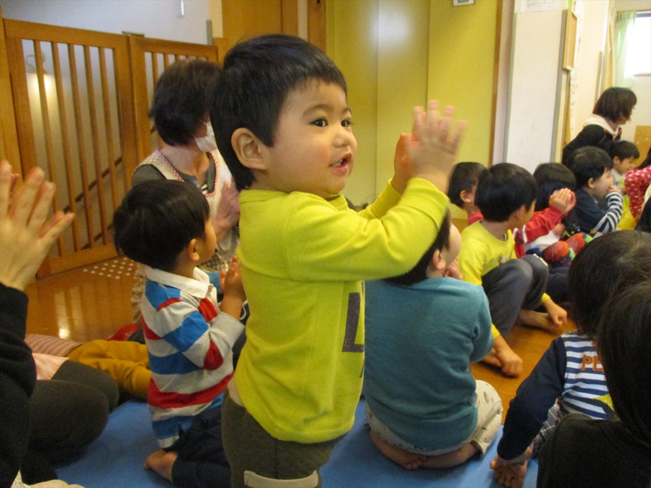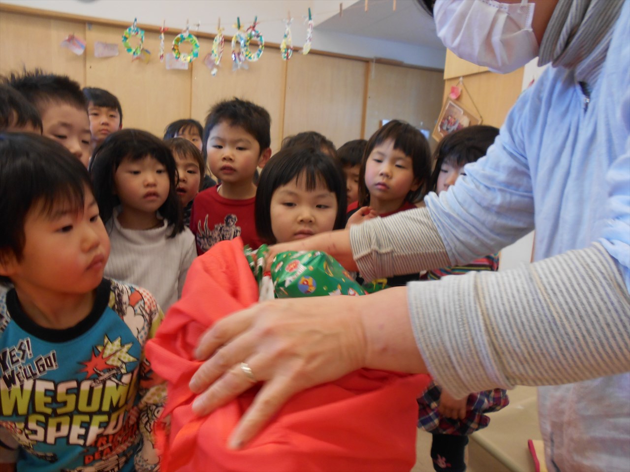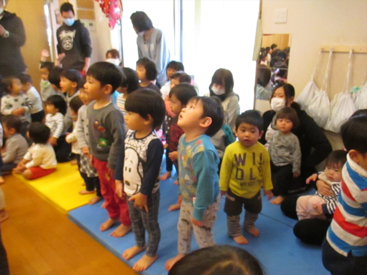 ホールにみんな集まって、クリスマス会を行いました。まずは、ぶどう組のピアニカ演奏。ドキドキ緊張しているお友達だちもいたようですが、一生懸命が伝わってきました。