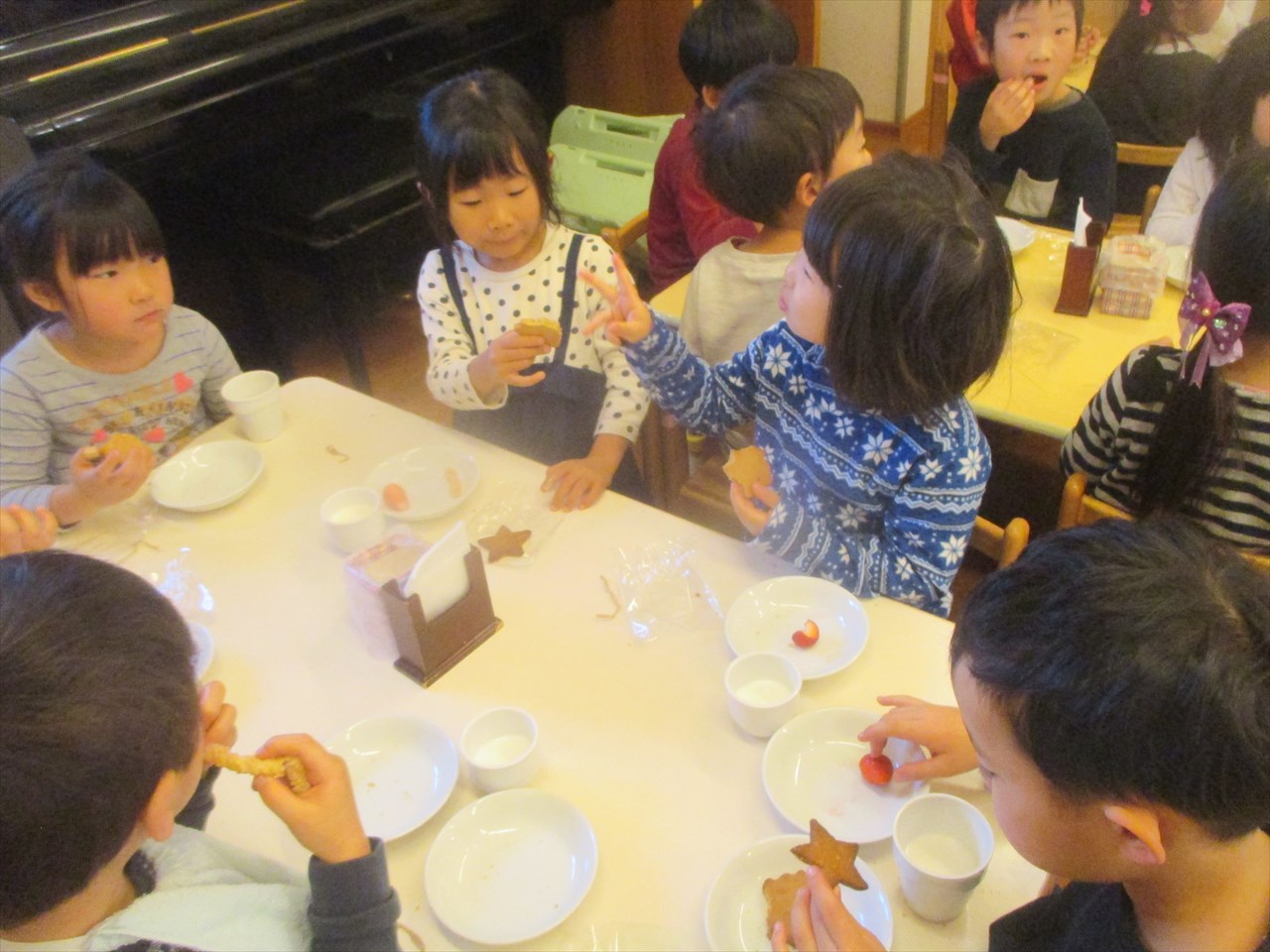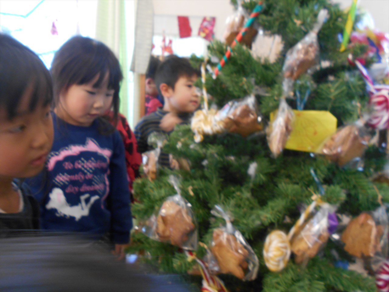 おやつはクリスマスツリーについた手作りクッキーを取って、いただきま〜す