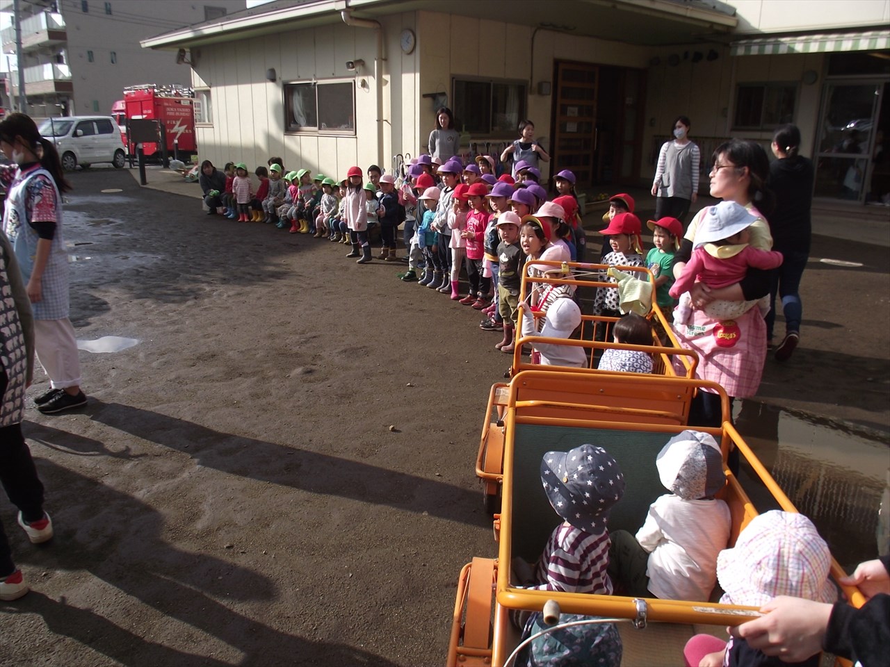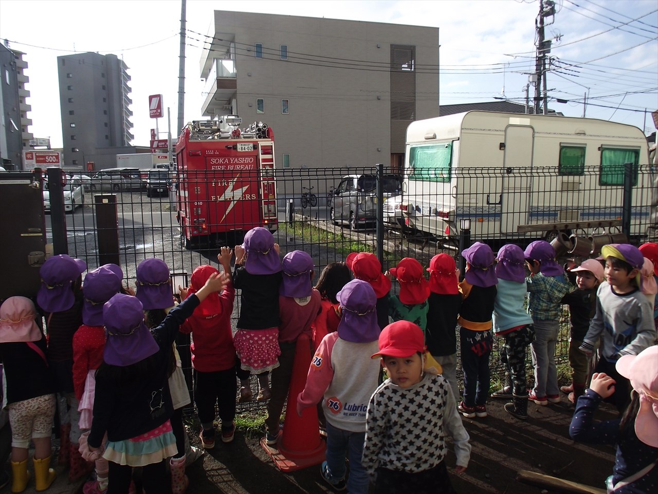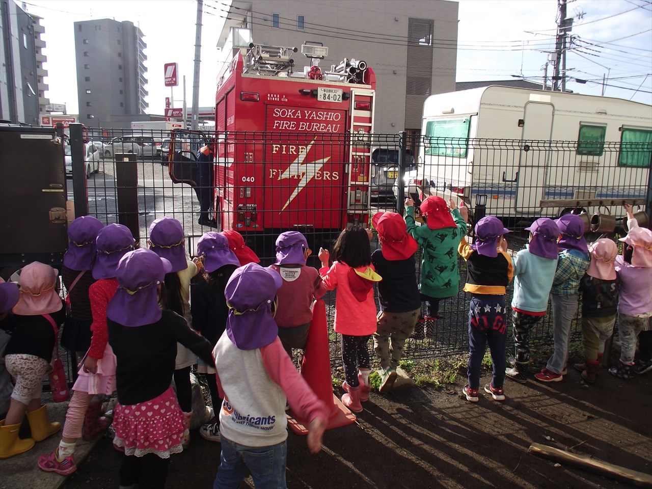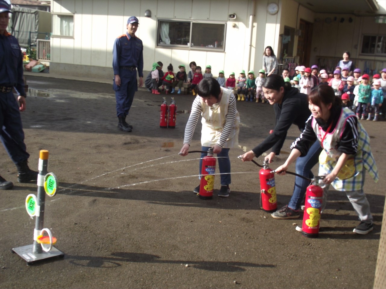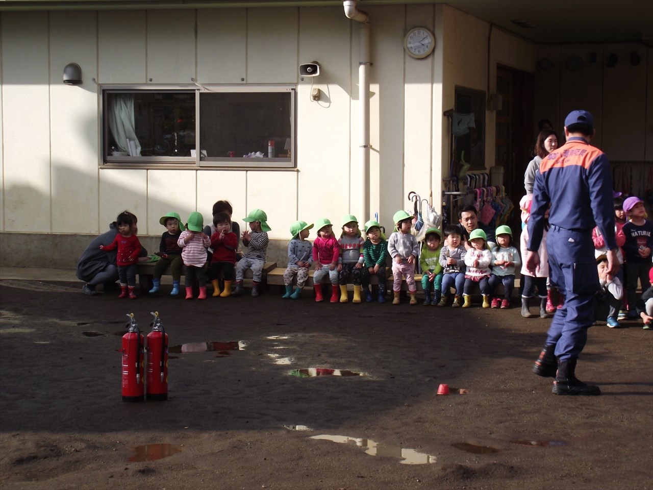 八潮市消防署の方立ち合いで避難訓練を行いました。 大きな地震がり、給食室から出火という設定で園庭へ避難しました。